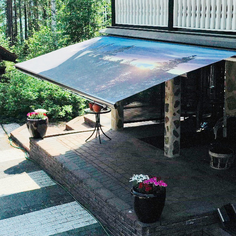 UV-tulostetut markiisikankaat käsittelemme nano-luokan suoja-aineella, mikä helpottaa markiisin puhtaanapitoa ja suojaa kangasta auringon paahteelta. Suojamme ei sisällä silikoneja, fluorihiilivetyä, teflonia tai muita terveydelle haitallisia yhdisteitä.